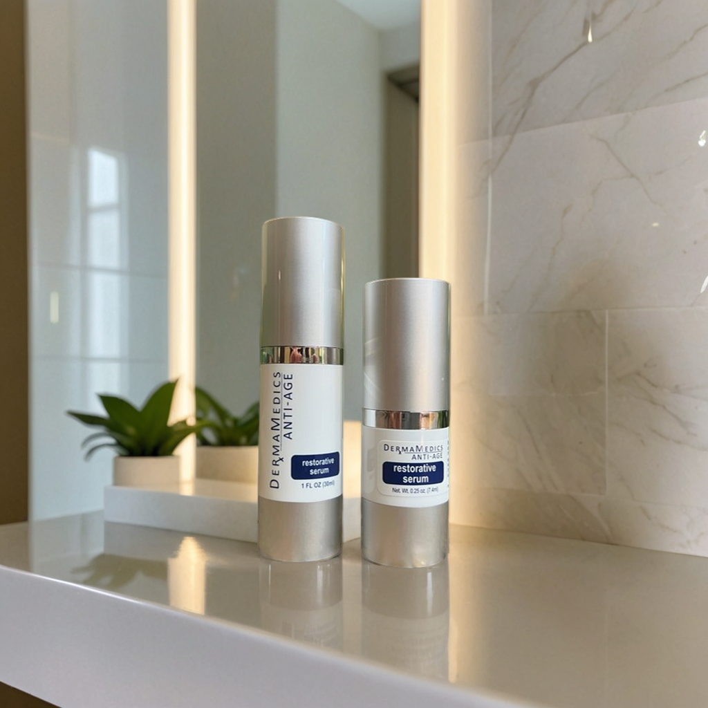 Restorative Serum contains a unique and powerful form of Vitamin C along with Therosol and 2 additional patented, high potency antioxidants. These potent ingredients are blended together with skin friendly natural oils into a gentle silicone based serum that can be used on even the most sensitive skin. The cosmetic silicone in the product minimizes the appearance of lines and wrinkles while the powerful antioxidants block free radicals which can damage and age skin. Restorative Serum utilizes DermaMedics' proprietary "bioactive phase partitioning" technology to deliver these age-defying ingredients to the skin at high concentration. This serum is ideal for use prior to applying makeup. Can be used morning and night to help retain moisture and prevent dryness. This gentle moisture-retaining formulation is non-comedogenic, designed for sensitive skin, and preservative-free.