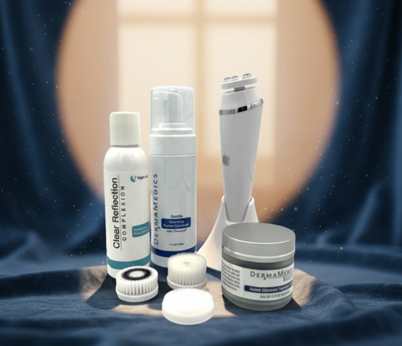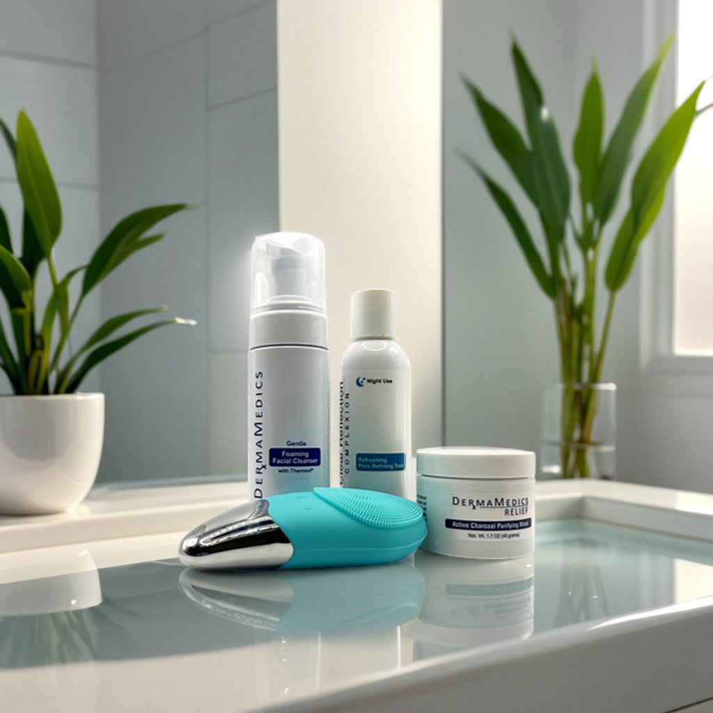 DermaMedics new pore cleansing and facial detoxifying system combines 4 products to deep clean your skin and purify your pores. The system removes dirt and impurities deep within the pores to give you a radiant and smooth complexion. The Foaming Cleanser is soap-free and pH balanced and will not leave your skin feeling dry and tight. The Pore Refining Toner is a maximum strength alcohol astringent toner that deep cleans pores to help minimize pore size and purify the skin. The Active Charcoal Purifying Mask tightens the pores and increases exfoliation of dead skin cells while detoxifying the skin with charcoal and antioxidants that fight free radicals. The mult-speed sonic facial brush maximizes the deep cleansing action of the Foaming Facial Cleanser. This system contains the following products: