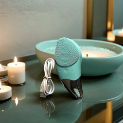 This variable intensity sonic facial brush uses high frequency vibration to deeply clean the skin to remove dirt, cosmetics and oils. The silicone massaging head gently exfoliates dead skin cells while the high frequency pulse stimulates the skin. The pulse frequence is easily controlled by using the + and - buttons on the device. The use of DermaMedics Foaming Facial Cleanser is recommende. Unit can be used in the shower.